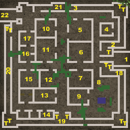 Mines with trigger crystals line this hallway. If you set off any of the crystals, the mines become active... and so do the Reaper Turrets marked T. |