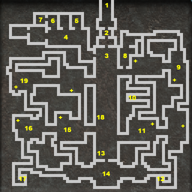 The door takes 1 living tool at 13 Mechanics. The cabinet here has 2 madness gems and 2 blast crystals. The are healing and essence pools further back in the room. |