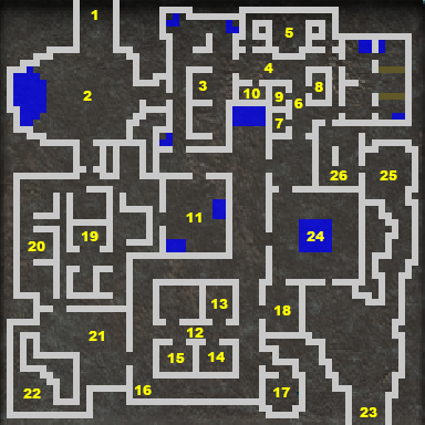If you have the Glowing Blue Key or are willing to burn a fair amount of living tools opening the western door, you can go around room 24 here and grab the loot in 26 before Rhakkus arrives to cause trouble. |