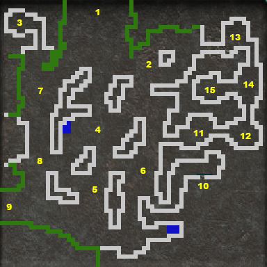2 corpses are here. They contain a venom baton, a healing pod, an iron breatplate, and 13 coins. Some venom thorns are on the ground. 2 Iron Clawbugs patrol just to the south of here. |