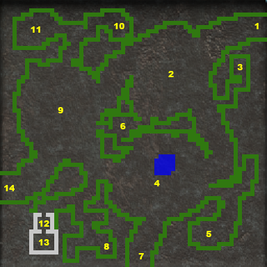 A Shepherd Vlish, 2 Stinging Clawbugs, and 2 Iron Clawbugs are patrolling here. A corpse in the NE of this area contains a fine cloak, chitin armor, a silver ring and a healing pod. |