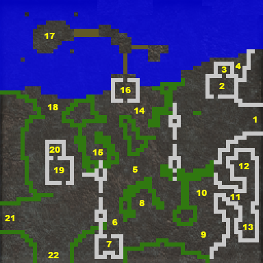 2 Battle Alphas and a Glaahk. A corpse in the northwest corner contains a chainmail vest, 20 coins and a hypnotic wand. |