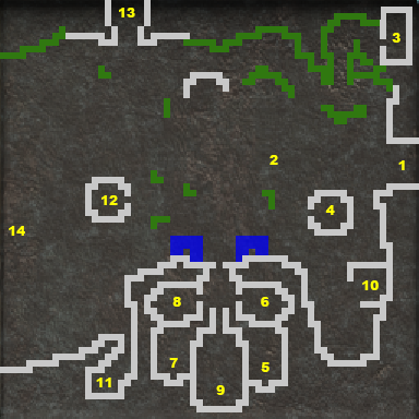 This cave contains a Surly Cryoa. Much tougher than the other cryoas in this zone. There are a couple of javelins on the ground here. The nest contains 105 coins, a healing pod, and a gold ring. |