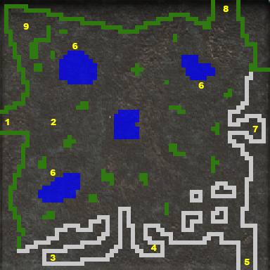 A succession of ghosts attack in this area, including: 4 Risen Shades and a Risen Warrior. They get tougher. There are 5 coins on the ground and the shades drop crystals and gemstones of increasing value. The warrior may drop Specter Boots (+20% poison and energy resistance to yourself and your creations). |