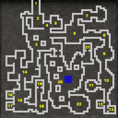 3 Servile Casters, a Terror Vlish and Quorn (powerful caster leader). Quorn drops a ruby and a reflecting shield. There are 17 coins on the floor here. Click on the alter to take the Iron Bandit Key. |
